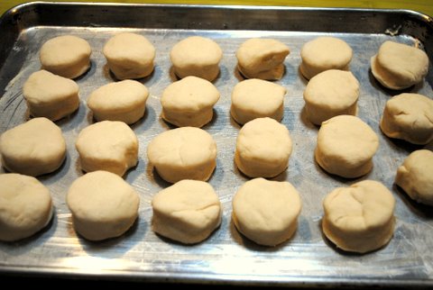 Time to grab your rolling pin and roll the dough out to just over 1 inch thickness, then with floured cutter or glass cut into small biscuits.
