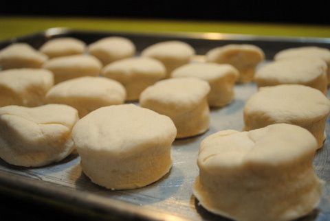 Gently plop biscuits onto greased baking sheet and set aside for about 10 minutes while your oven heats to 400F.