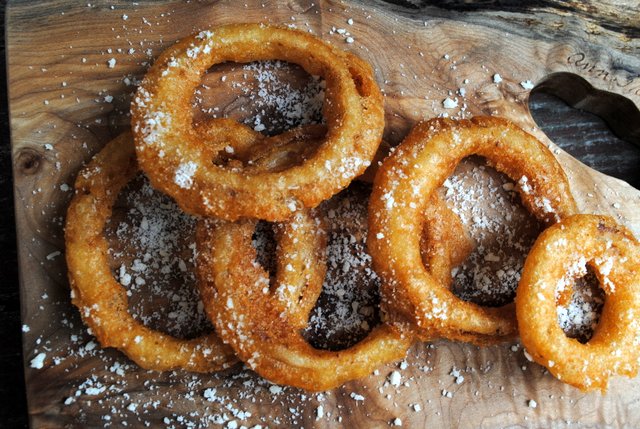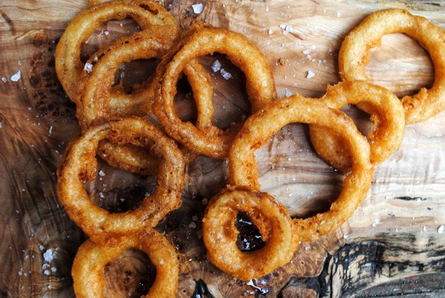 Nowadays I find we have to be a bit pickier before ordering up onion rings.  'Cuz we want them good, crunchy and reminiscent of those olden day goodies of our memories.  Right?