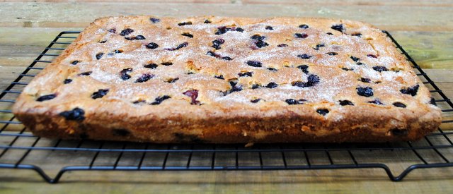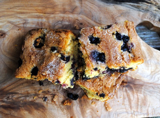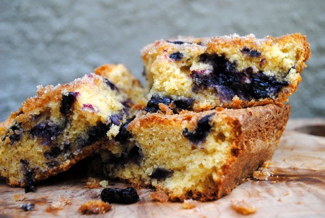 A crumbly, moist, rich, butter cake, riddled with fresh blueberries, boasting a divinely crunchy cinnamon sugar top crust. Is it for breakfast? Or dessert?