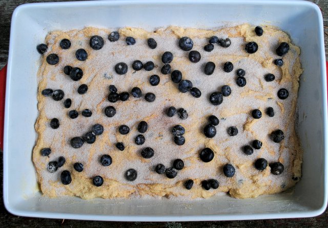 For the topping: Scatter blueberries over top of batter. Stir sugar and cinnamon together in small bowl and sprinkle over batter.