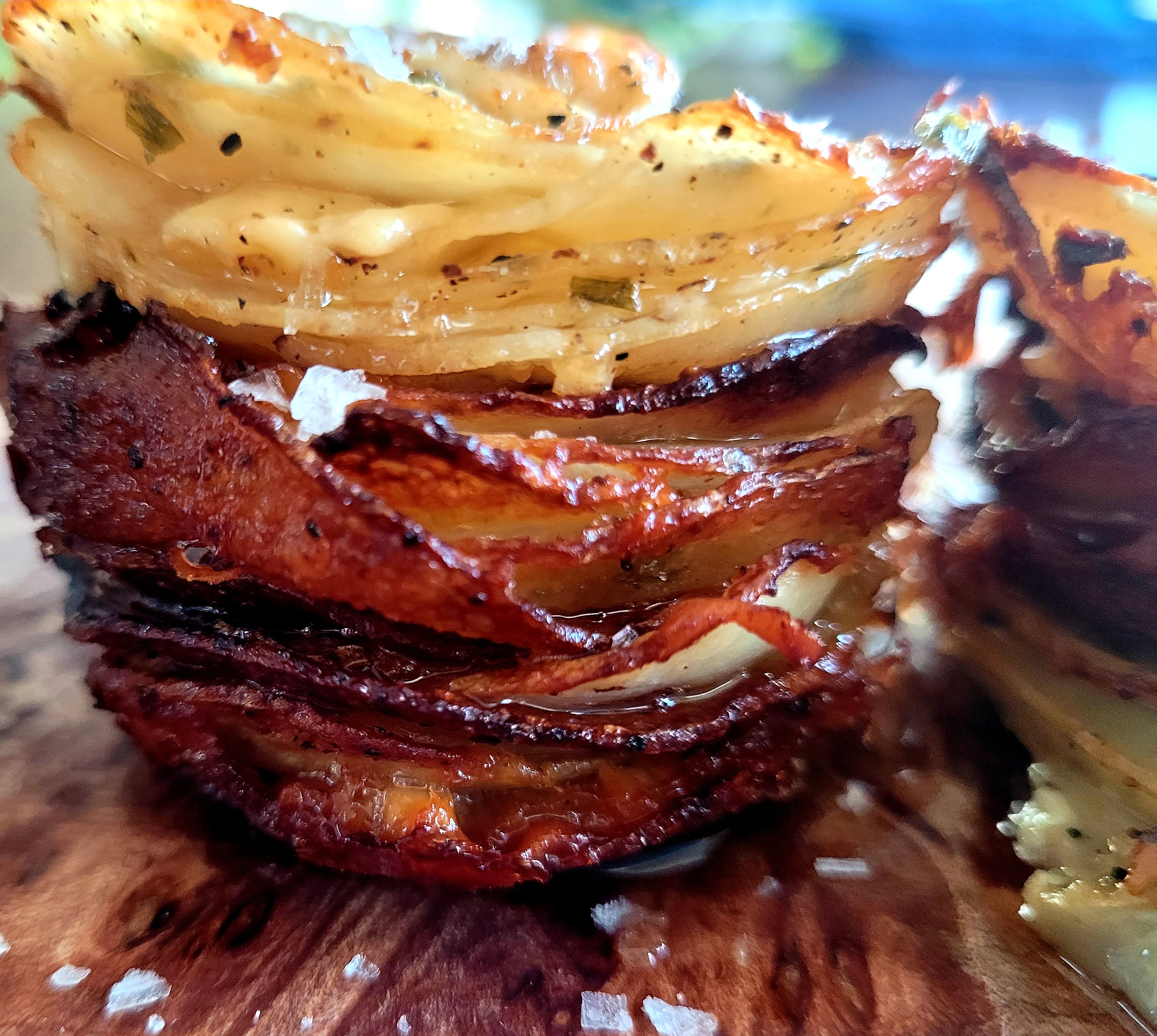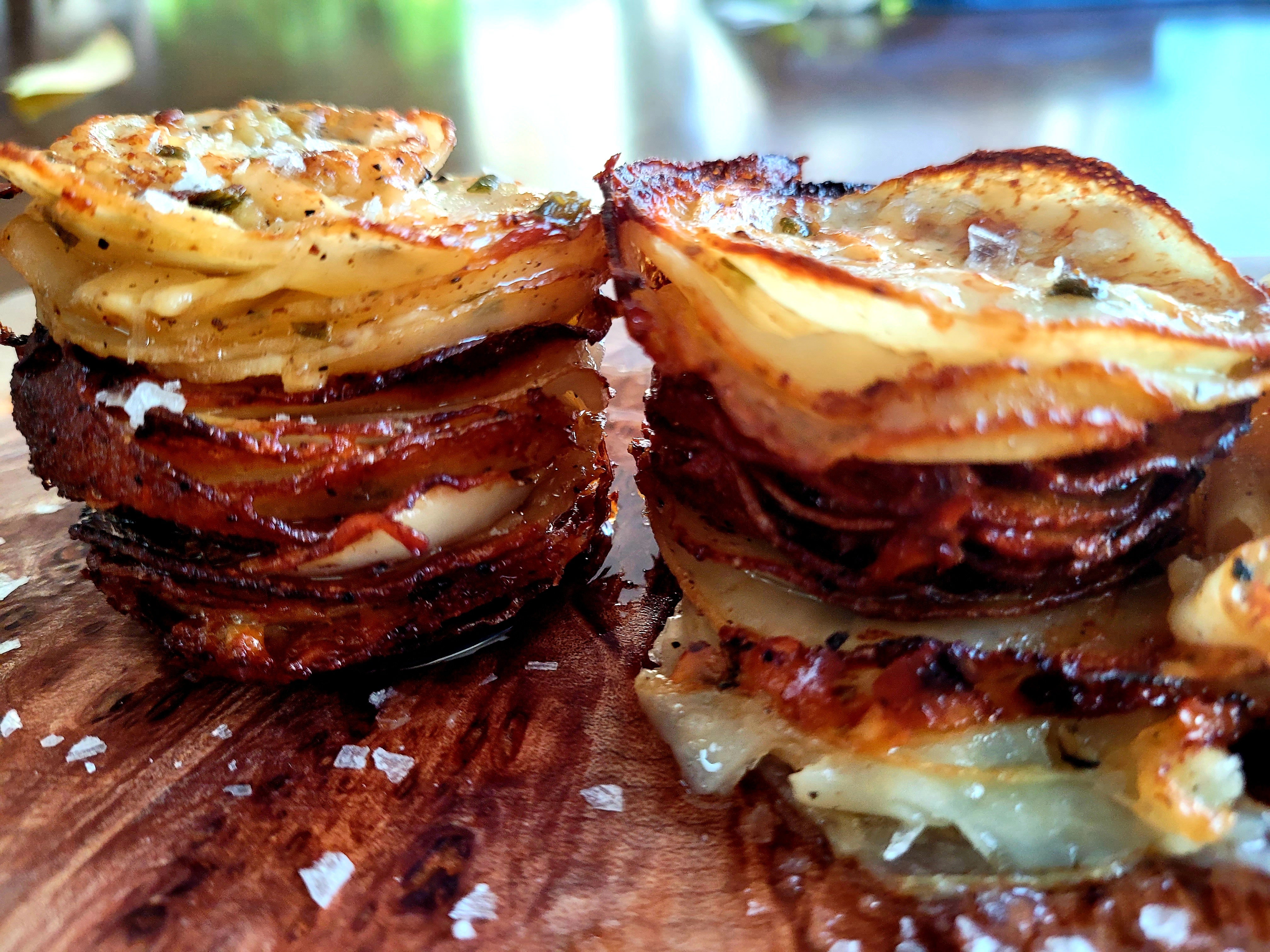 Cover with foil and place on baking sheet. Transfer to the oven and roast for 30 minutes. Remove the foil and continue cooking another 25 minutes, or until the potatoes are tender and golden. Run a butter knife around each stack to release them. Stack 'em up and serve immediately sprinkled with a wee bit of sea salt flakes. Ta Da!