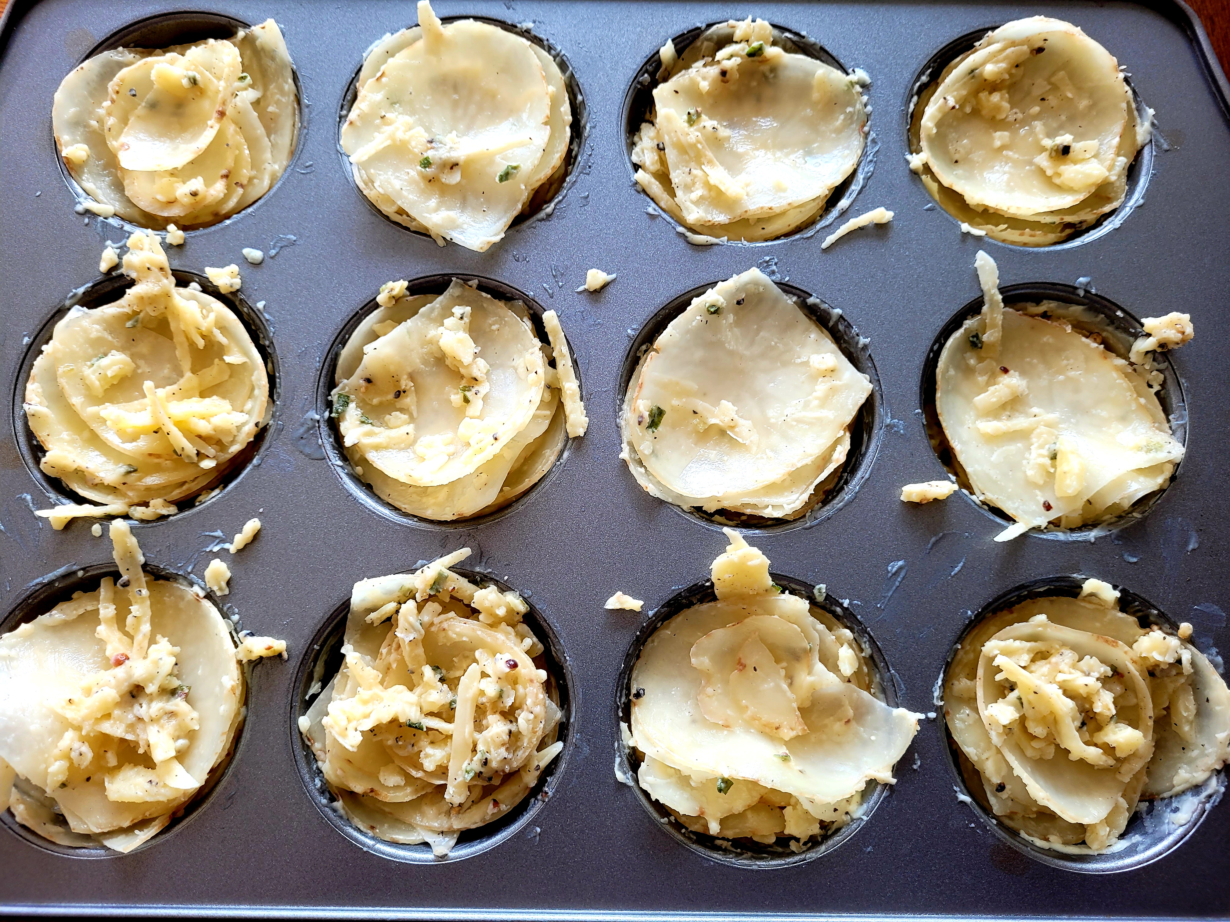 After that it's just a matter of tossing the almost paper-thin potato slices with the cheesy garlic butter and then stack, stacking, the flavour coated slices into a muffin tin.