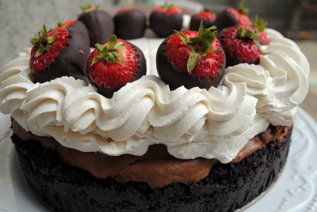 For topping: Whip 1 1/2 cups whipping cream with 2 tablespoons sugar and a teaspoon of vanilla until quite stiff. Loosen crust on all sides using a sharp knife. Remove outer ring of pan. Place pie on serving plate. Smooth a good layer of whipped cream over top of the mousse pie, then decorate edges with a piping bag, if desired. Plop on some Callebaut chocolate covered strawberries and voila!