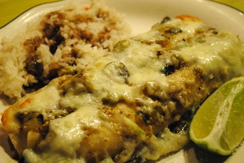 Spoon a good 1/3 cup of filling down centre of each tortilla. Roll tightly and set seam side down in prepared baking dish. In a small bowl mix together salsa, diced green chiles, green onions and olives. Spread salsa mixture evenly over tops of enchiladas and sprinkle with grated cheese. Bake uncovered until heated through about 25 – 30 minutes. Squeeze lime juice over just before serving and serve alongside a full bottle of Hawaiian chili pepper water or your favorite red or green pepper sauce.