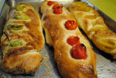 When dough is ready plop onto prepared baking sheet and preheat oven to 400F. Cut dough into 3 equal pieces. Stretch each piece of dough into long, kind of irregular baguette shapes. Top each baguette with your choice of a few grape tomatoes, pickled peppers, or olives. Sprinkle with some kind of yummy, crunchy sea salt. Brush with a little more extra virgin olive oil. Bake 15-25 minutes until crusty golden brown. Cool 5 minutes before munching. Then, munch happy.