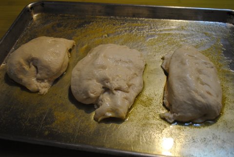 Here we go……….Once your breadmaker has done the Dough Cycle, it’s time to play. Have a large rimmed baking sheet ready, ready, freddy with a good smearing of great quality extra virgin olive oil and a sprinkling of cornmeal. Plop your dough out onto prepared baking sheet.