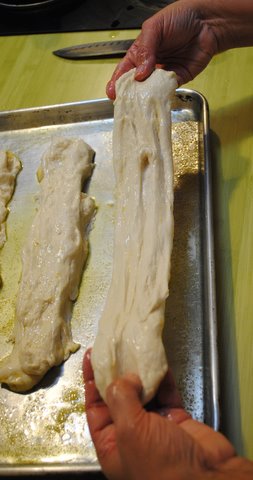 Now, take each piece and pulllllll out to form a rough baguette shape.