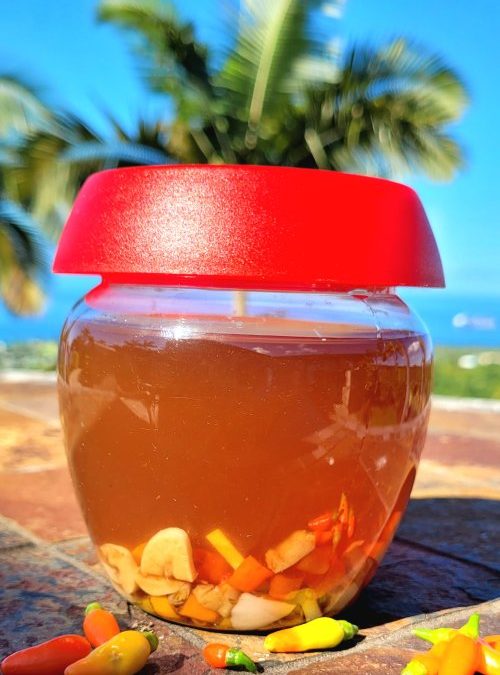 The ingredients for Hawaiian Chili Pepper water are simple, there is no wrong way, or right way, but many variations ~ water, chili peppers, garlic, vinegar, salt ~ some add fresh ginger, soy sauce.  Play, until your taste buds jump up and down with spicy delight.