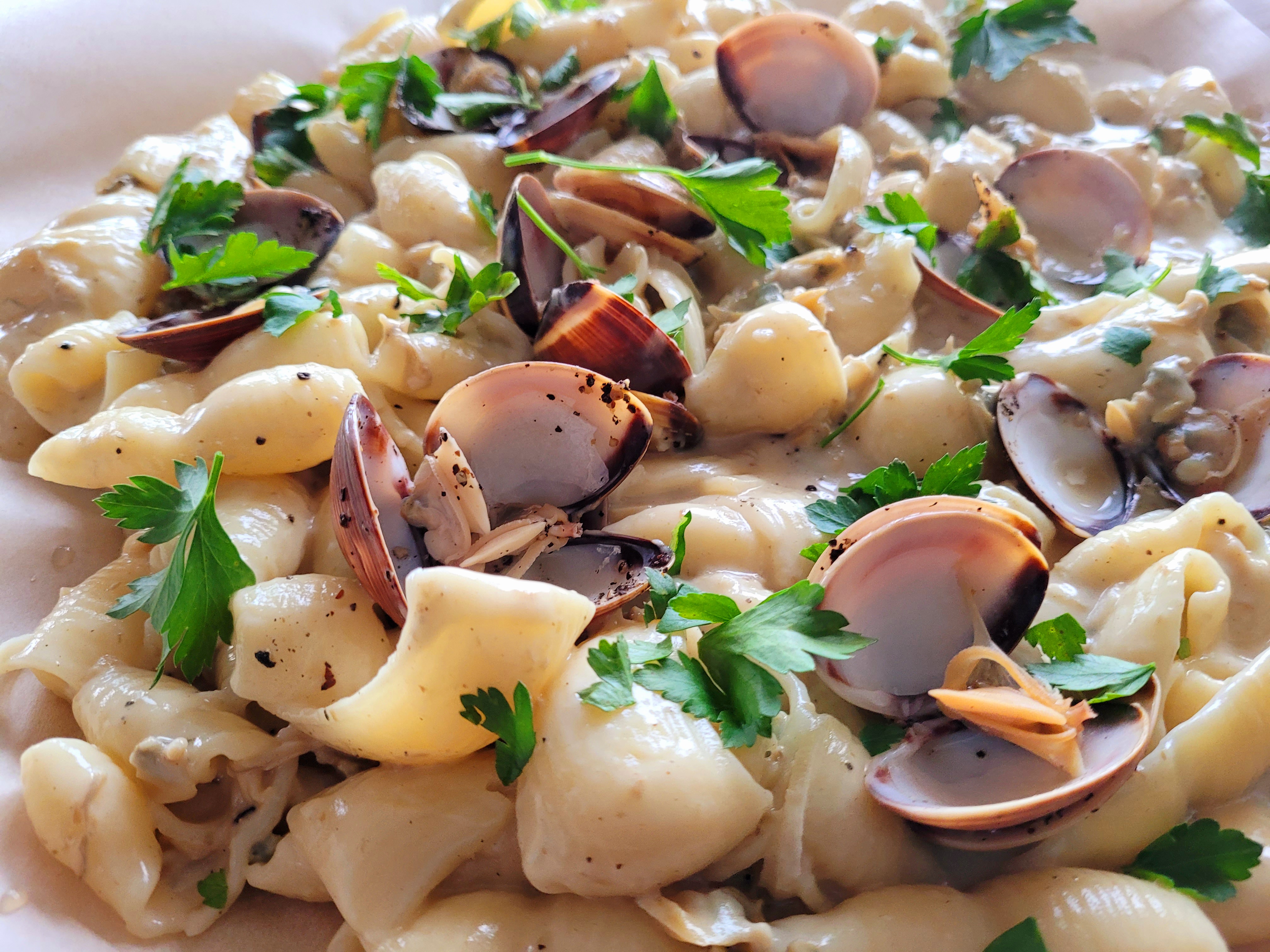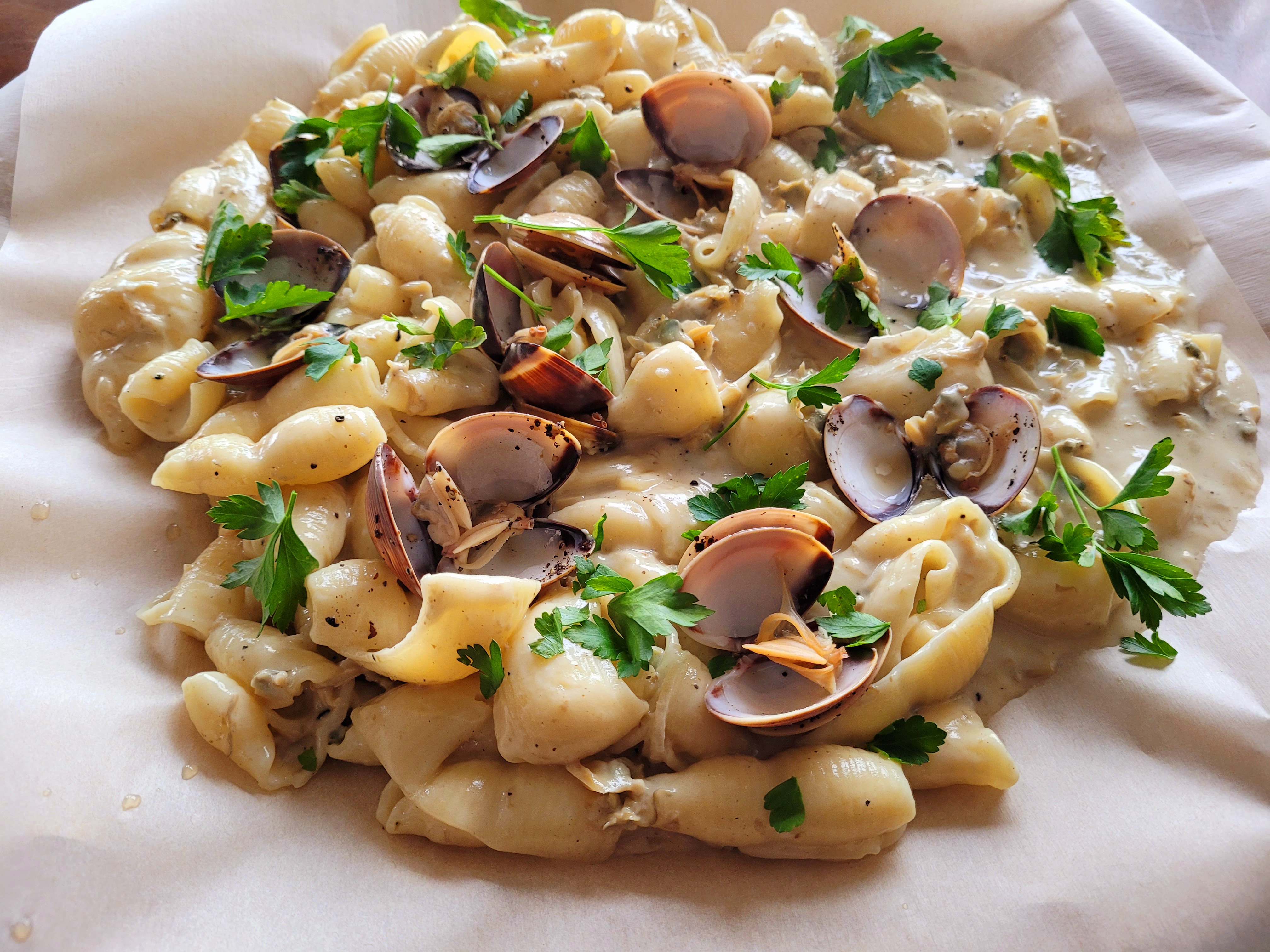Oodles of baby clams jumbled and tumbled into a decadently creamy, but at the same time down-home sauce, boasting plenty of tangy Parmesan, and topped off with some freshly-steamed, still-in-the-shell, baby clams. Yes, please!