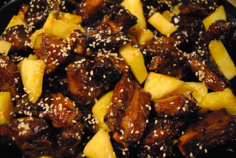 Arrange kuawa-ed riblets on serving platter; garnish with lemon and lime wheels or fresh pineapple chunks and serve those tender sticky little buggahs hot with lots of napkins. And frosty cold beer or guava juice on ice. 12 or so pupu servings.