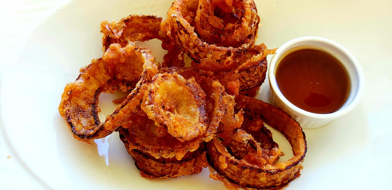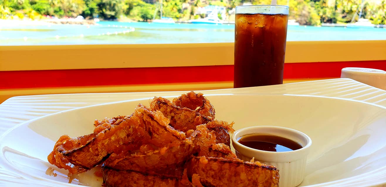 But, back to the menu…..decisions, decisions…..Beach Pina Colada Shrimp or Creole Pasta with Catch of the Day or Curry or Jerk Chicken, or, or, or…. Hmmm. Definitely leaning more towards snack, than meal, so after far too much menu re-inspection, I ordered Onion Rings. Yup, kind of weird, but, oh Mama! am I ever glad I did!!