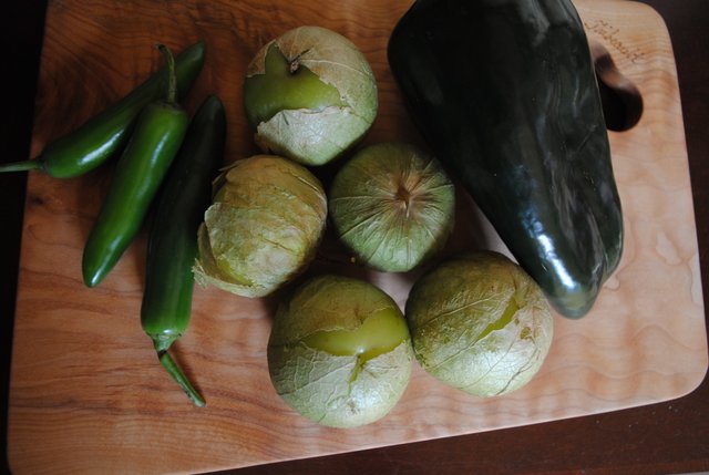 First of all, get your hot little hands on some fresh tomatillos, poblanos and serranos…