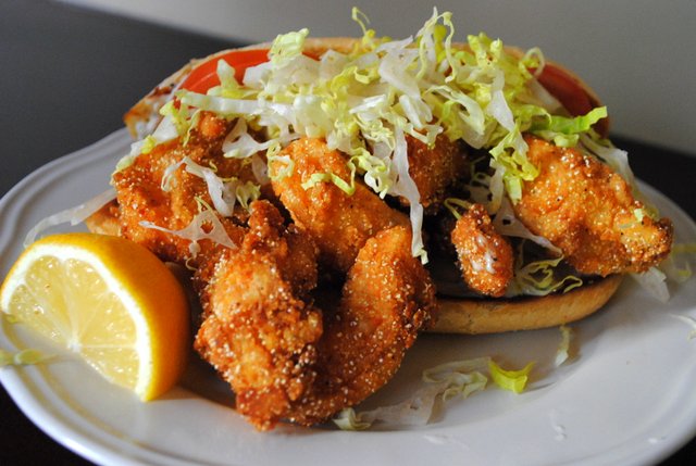 The Big Easy. New Orleans. I still want to go there one day. A lot. Bourbon Street. Dingy, smoky basement blues bars. Voodoo. Potent, sweet Hurricanes (the drinks not the winds). Voodoo intrigues me. And those bottle trees. Bananas Foster. Shrimp Po' Boys. Brad Pitt (they're my thinks, I will if I want!) Thrumming Jazz. Beignets. Muffulettas. Emeril. Swamps. Mysterious, dangerously ominous swamps. Gators. Jazz riffs. Shrimp Po' Boys. Gumbo. Why haven't I ever made Shrimp Po' Boys?