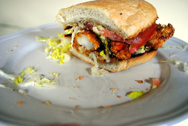 Crazily crunchy, wham-bam spiced, fried shrimp, tucked into a crusty-outside-soft-inside French roll with shredded iceberg, heat jolted slices of fresh tomato and a generous slathering of homemade tartar sauce with a devil of a fever. Oh baby!