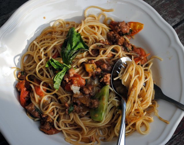 Remove the bolognese from the heat and stir in the Parm and basil.