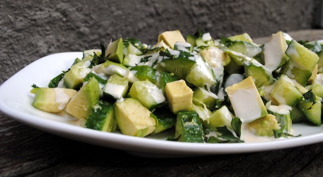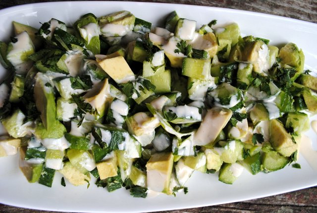 Combine cucumber, green onions and avocado in a bowl. Whisk together mayo, lime and seasonings, adjusting levels to taste. Drizzle salad with dressing. Gently toss, if it suits your fancy to make sure all those glorious greens are cloaked in the dressing. Or just leave the drizzles, as they are. How can you go wrong? Garnish with cilantro or parsley, and serve.