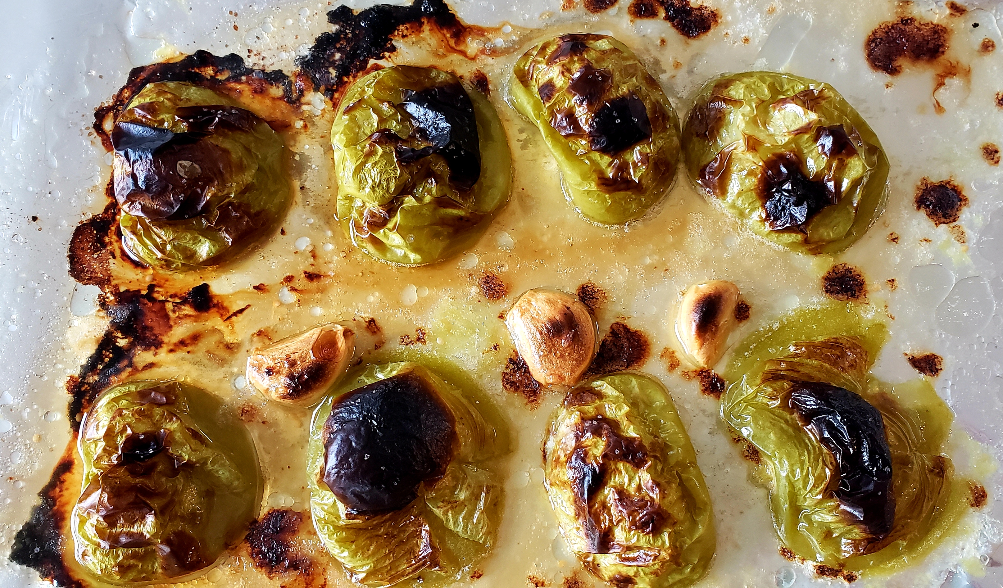 Preheat oven to 425F. Cut 4 of the tomatillos in half and place on baking sheet with garlic cloves. Drizzle with 1 tablespoon of olive or avocado oil and toss to coat. Place tomatillos cut-side down. Roast 20 minutes. Put broiler on, continue to cook 5-7 minutes more, watching carefully, until those tomatillos are blistered and charred, just right. Set aside to cool.