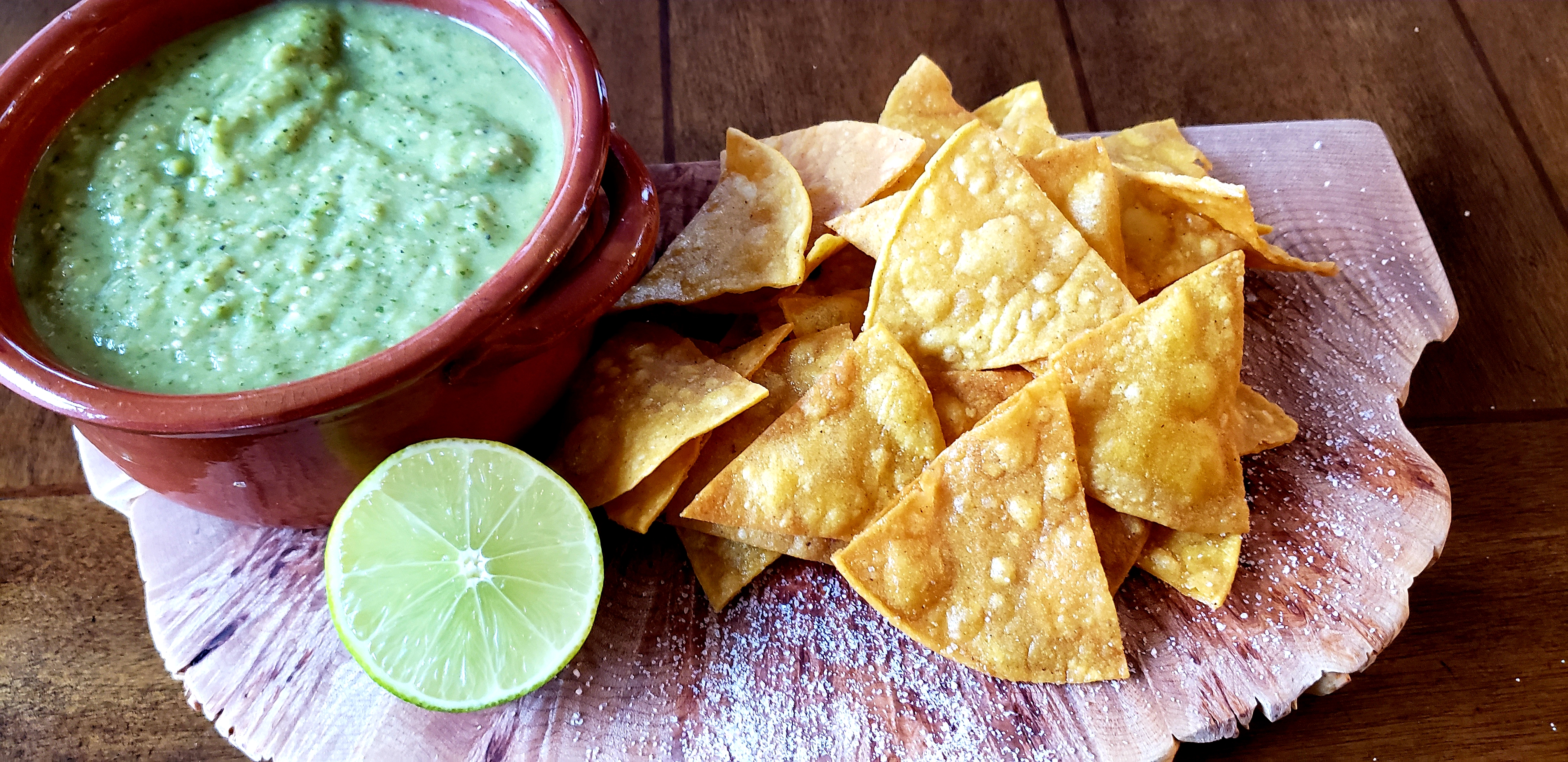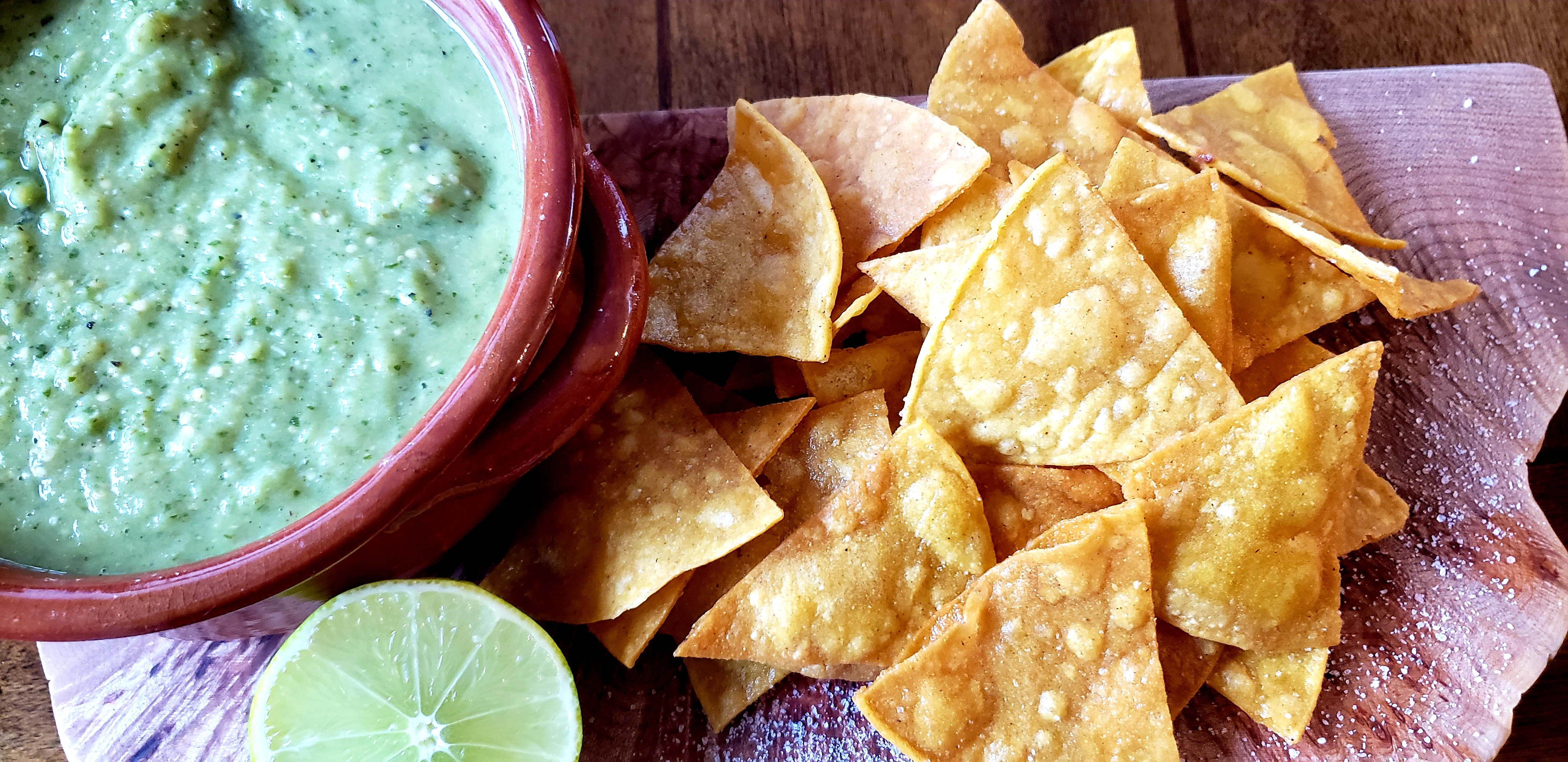 I don't always fry up fresh tortilla chips, when we are munching chips and salsa, but for the debut of this new Tomatillo-Avocado Salsa, I couldn't resist. I'm so glad I did. Saludos!